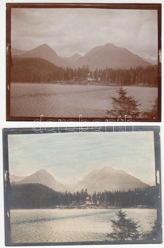 cca 1900 Magas-Tátra, 2 db azonos tájkép, az egyik kézzel színezve, 9x12 cm