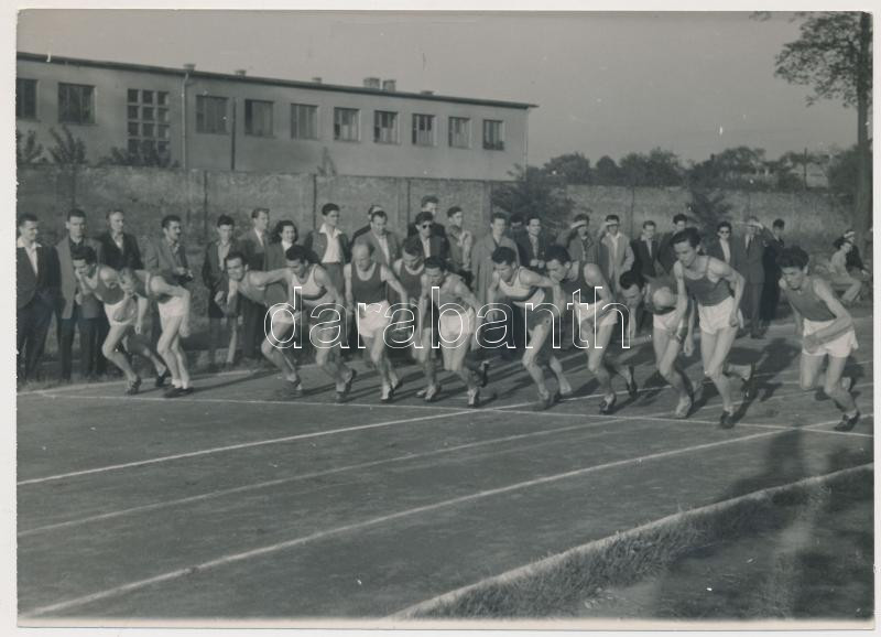 cca 1950 Bojár Sándor (1914-2000): Futóverseny rajtja, pecséttel jelze...