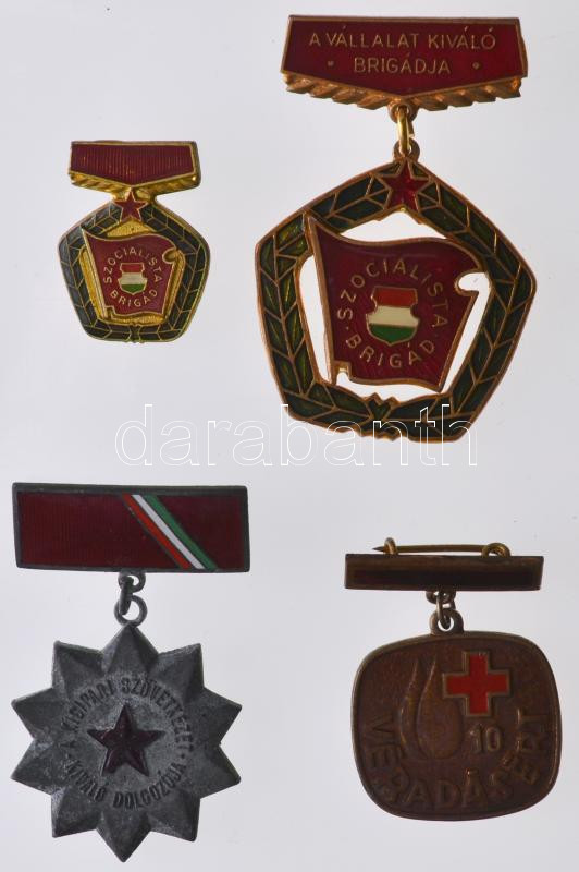 ~1960-1970. "A Vállalat Kiváló Brigádja" kitüntetés miniatűrrel, dísztokban + ~1960. "A Kisipari Szövetkezet Kiváló Dolgozója" zománcozott fém csillagformájú jelvény tokban + ~1970. "Véradásért" 10 alkalom után járó kitüntetés T:2,3,2-
