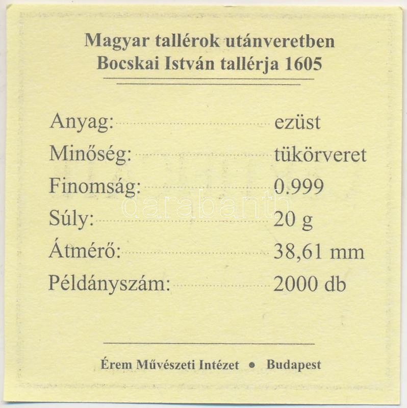 "Magyar tallérok utánveretben - Bocskai István tallérja 1605" Ag emlék...
