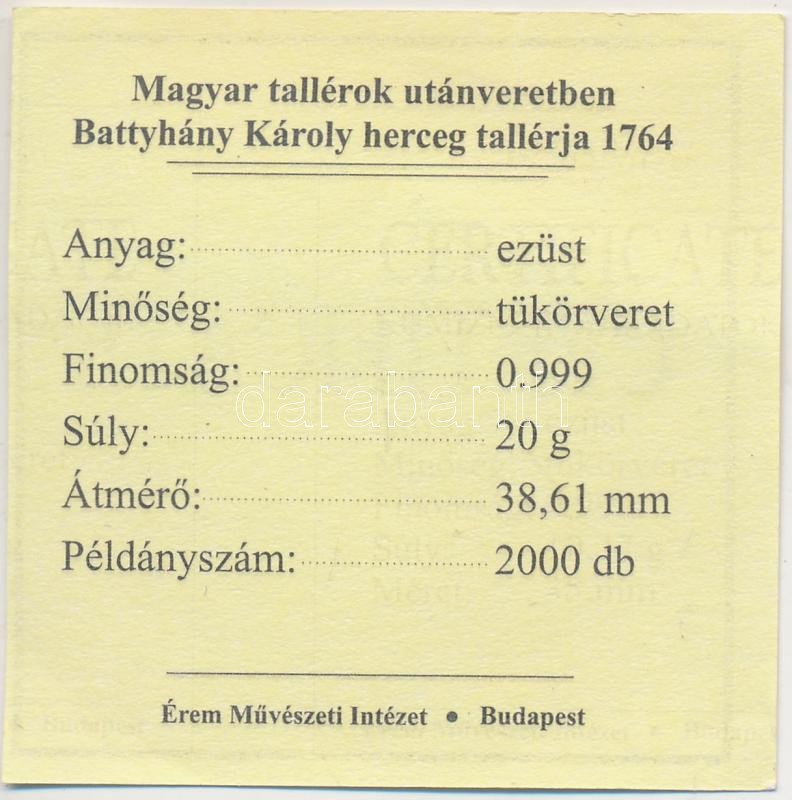 Magyar tallérok utánveretben "Battyhány Károly herceg tallérja 1764" Ag emlékérem (20g/0.999/38,6mm) T:PP Tanúsítvánnyal