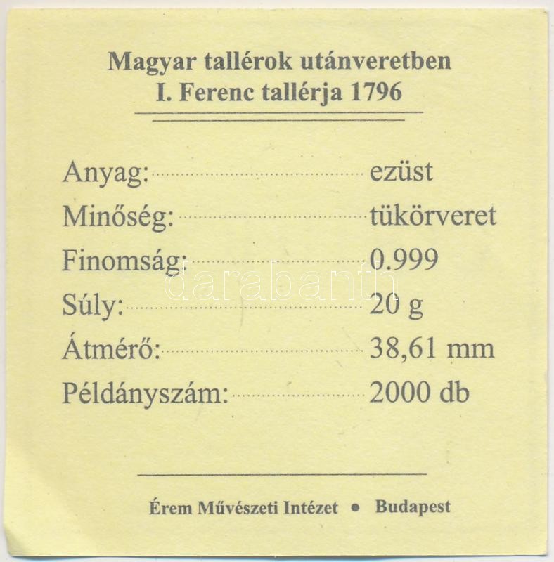 Magyar tallérok utánveretben "I. Ferenc tallérja 1796" Ag emlékérem (2...