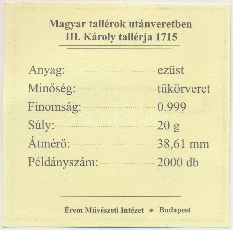 Magyar tallérok utánveretben "III. Károly tallérja 1715" Ag emlékérem ...