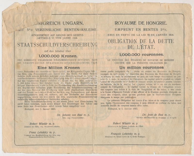 Budapest 1925. "Magyar Királyság 5%-kal kamatozó Járadékkölcsön Államadóssági Kötvény" 1.000.000K-ról szelvényekkel T:III-