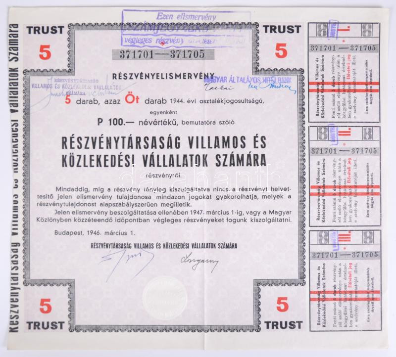 Description: Budapest 1946. "Részvénytársaság Villamos és Közlekedési Vállalatok Számára" részvényelismervény 5db egyenként 100P névértékű részvényről bélyegzésekkel, szelvényekkel T:II