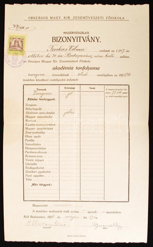 1926 Hubay Jenő (1858-1937) zeneszerző, hegedűművész és Moravcsik Géza (1855-1929) zenetanár aláírása iskolai évvégi bizonyítványon.