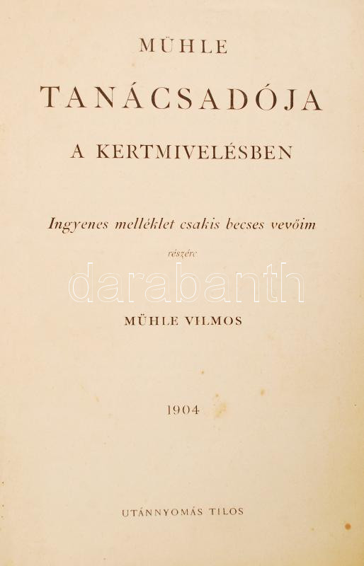 Mühle Vilmos: Mühle tanácsadója a kertmívelésben. Ingyenes melléklet csakis becses vevőim részére. Bp., 1904. 164p. Későbbi félvászon kötésben