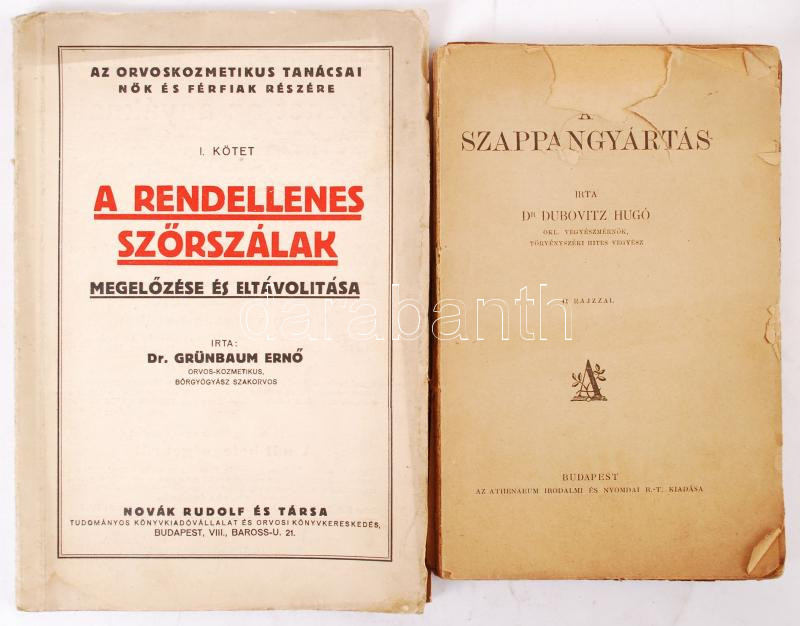 Description: 2 db kozmetikával kapcsolatos kiadás. Dr. Dubovitz Hugó: A szappangyártás. Bp., Athenaeum. Kötése hiányos, erősen viseltes állapotban; Dr. Grünbaum Ernő: A rendellenes szőrszálak. Bp., Novák Rudolf. Papírkötés, kopottas állapotban.
