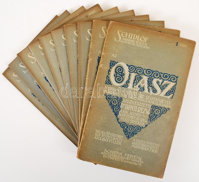 Description: Schidlof 1000 szó gyakorlati módszere világnyelvek magánúton való tanulására: Olasz. Szerk.: Honti Rezső. 1-10. füz. Bp., é. n., Schenk Ferenc Könyvkereskedése. Védőtokban, hiánytalanul. Kicsit kopottas, egyébként jó állapotban.