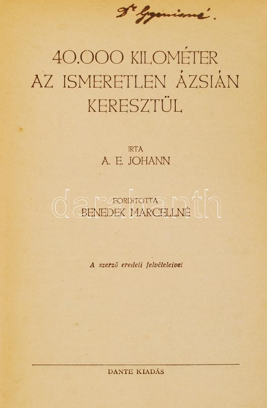 A. E. Johann: 40000 kilométer az ismeretlen Ázsián keresztül. A szerző felvételeivel. Bp., Dante. (Gerinc nélkül)