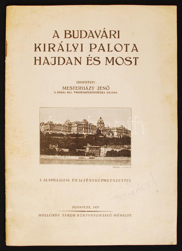 Description: Mesterházy Jenő: A budavári királyi palota hajdan és most. 3 alaprajzzal és 34 fényképmetszettel. Dedikált! Bp., 1929, Hollósy János Könyvnyomtató-Műhelye. Kiadói papírkötés, képekkel illusztrált, kissé kopottas állapotban.