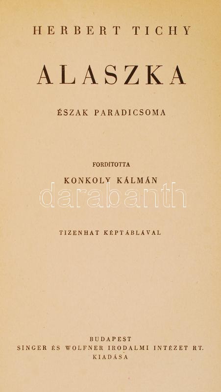 Tichy, Herbert: Alaszka, Észak paradicsoma. Fordította: Konkoly Kálmán. Tizenhat képtblával. Bp., 1939, Singer és Wolfner. Kiadói félvászon kötés, jó állapotban.