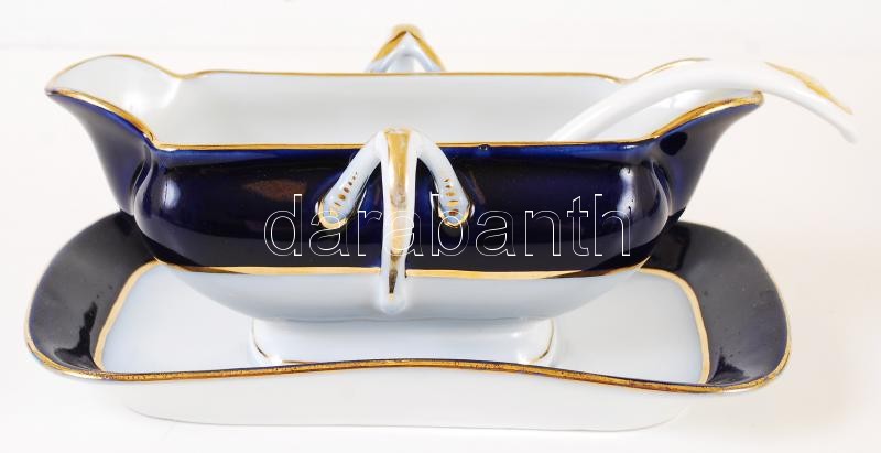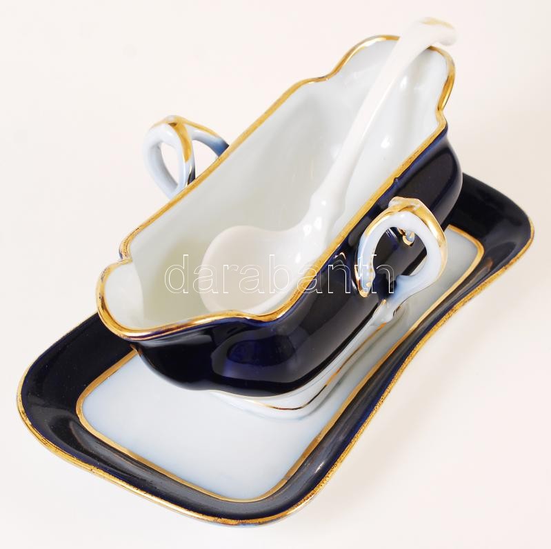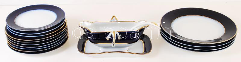 Description: Fischer Emil Császári és Királyi Szállító, Porcelángyáros jelzésű aranyozott kék-fehér tálkészlet: 10 db kistányér(egyiken hajszálrepedésekkel), 4 db nagytányér, 1 db szószos tál kanállal, jelzett