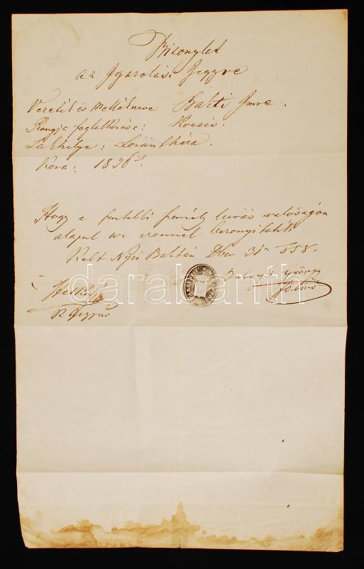 https://www.darabanth.com/en/219-Online-auction/219.0/Other-collectibles/Documents~500151/1858-Nyirbakta-varos-pecsetjevel-ellatott-igazolas~II935311