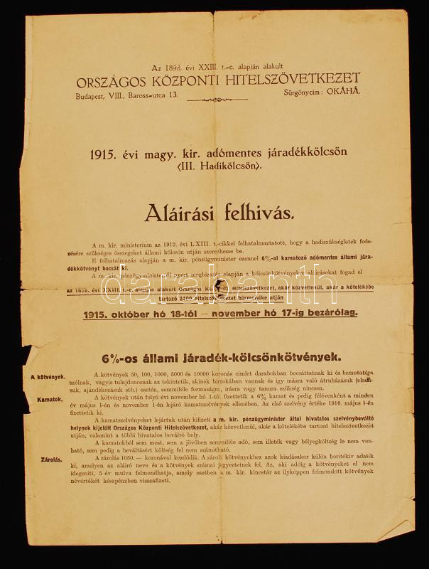 1915 Hadikölcsön aláírási felhívás, megviselt állapotban