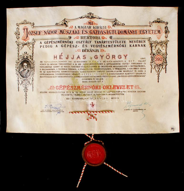 1938 Bp., Magyar Királyi József-Műegyetem által kiadott gépészmérnöki diploma ép függőpecséttel