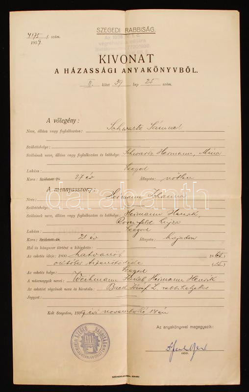 https://www.darabanth.com/en/219-Online-auction/219.0/Other-collectibles/Documents~500151/1939-Kivonat-a-szegedi-rabbisag-hazassagi-anyakonyvebol~II940312