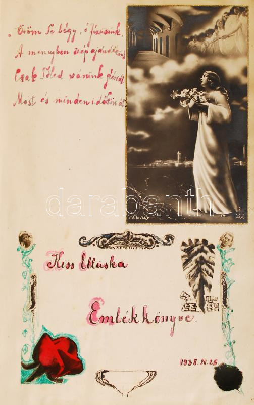 cca 1937-1938 Emlékkönyv sok fényképpel, bejegyzésekkel Rómából és különféle magyarországi helyekről. Vászonkötésben, aranyozott lapszélekkel, hasadt gerinccel.