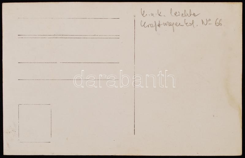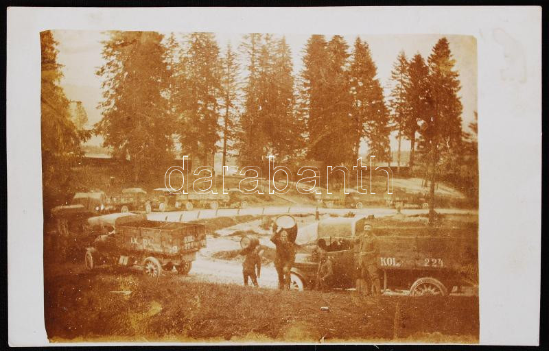 1916 K.u.k leichte Kraftwagenkolonne, gépkocsioszlop pihenője, hátolda... https://www.darabanth.com/en/219-Online-auction/219.0/Other-collectibles/Military~500007/1916-Kuk-leichte-Kraftwagenkolonne-gepkocsioszlop-pihenoje-hatoldalon-feliratozva-fotolap-~II939673