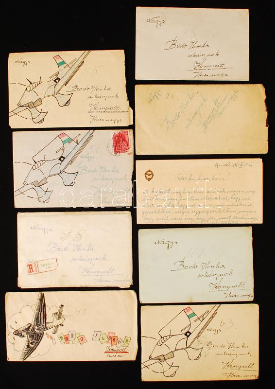 1942-1944 A Magyar Királyi Honvéd Légierő tagja által küldött levelek rajzos és dombornyomott címeres borítékban, 9 db