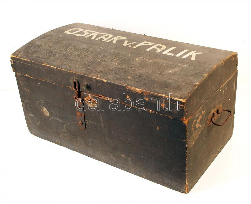Antik katonaláda, "Oskar v Palik" felirattal, fa, zár szerkezet sérült. 64×34 cm, m:31 cm