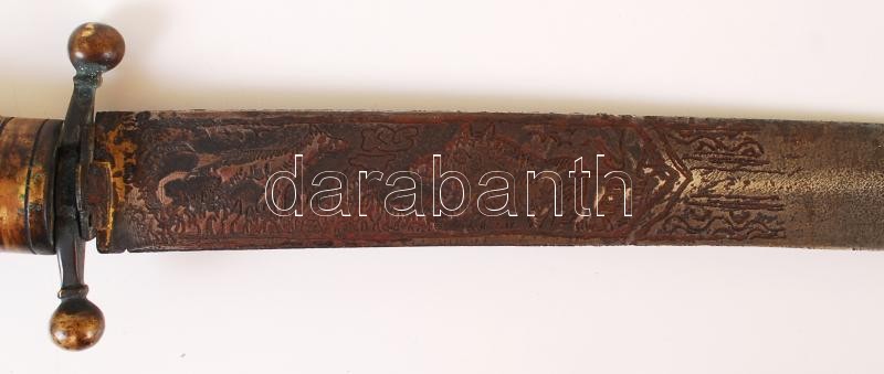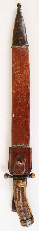 Antik vadásztőr, díszített pengével, vésett, csont markolattal, bőr-réz hüvellyel, h:50 cm