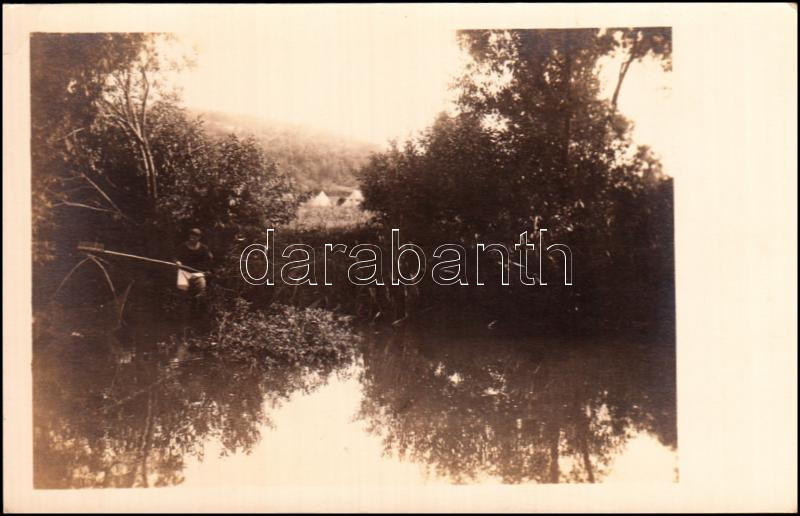 cca 1930 Halász merítőhálóval, fotó levelezőlapon, 10,5×8 cm