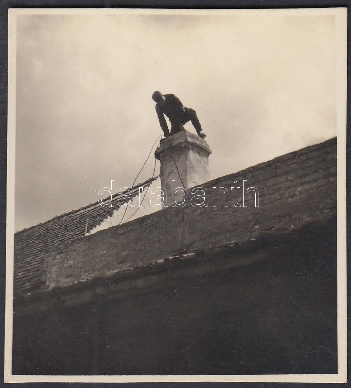 cca 1930 Pöltinger Gusztáv: A kémények akrobatája, jelzetlen fotó a szerző hagyatékából, 5x5 cm