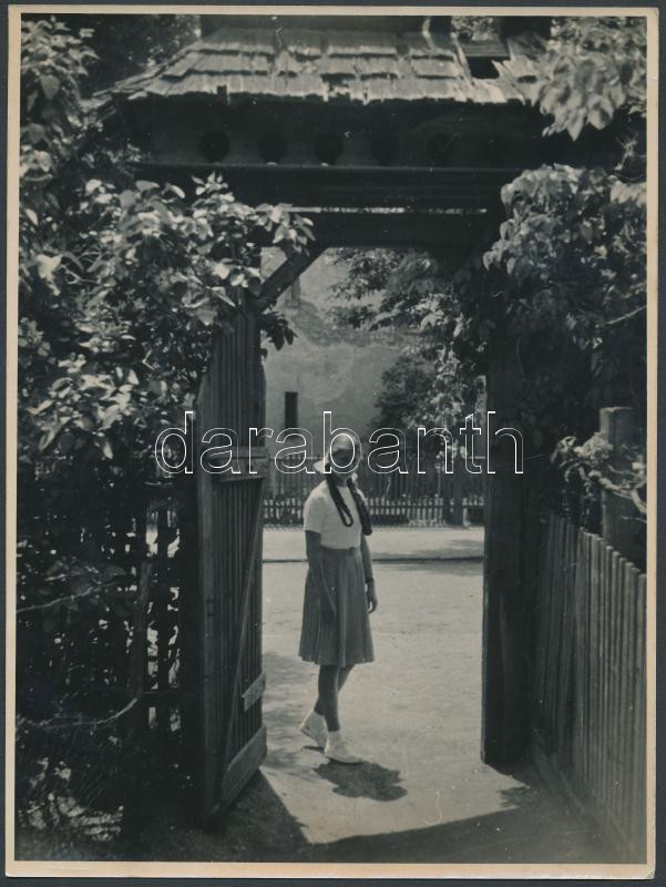 cca 1940 Fiatal leányka egy szép, galambdúcos székely kapu előtt, 24x18 cm