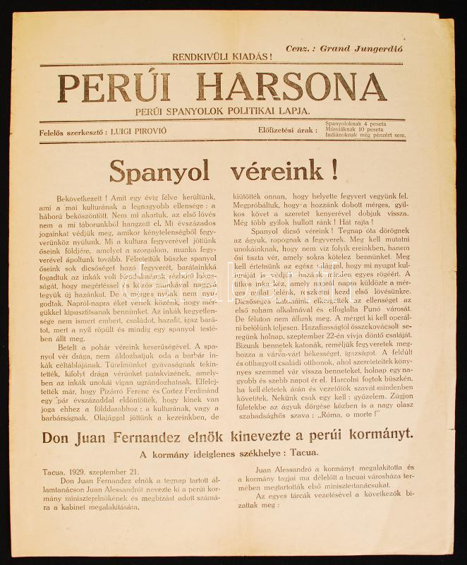 1929 Perúi Harsona, a perúi spanyolok politikai lapja magyar nyelven