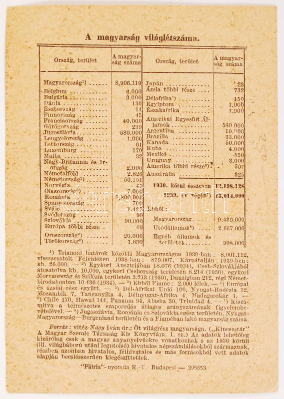 1939 A magyarok létszámát országonkénti bontásban bemutató táblázat levelezőlapra nyomtatva