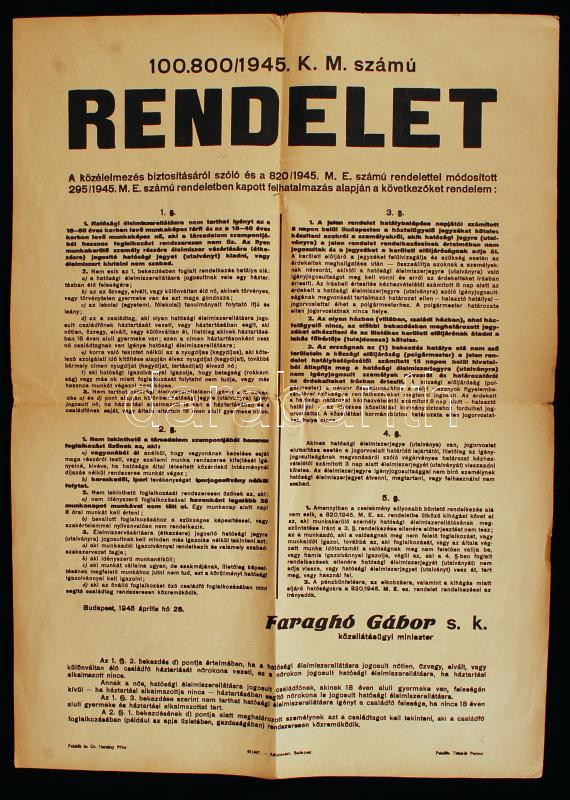 1945 A közélelmezés biztosításáról szóló rendeletet ismertető nagymére...