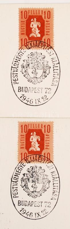 1946 Bp., Pestvármegye Újjáépítési Kiállításának emléklapja emlékbélyegzéssel, 10 filléres bélyeggel, 2 db