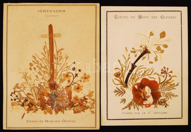 Description: cca 1887 Fleurs du Mont des Oliviers posées sur le St. Sépulcre. 2 db néhol hiányos préselt virág-kompozíció levelezőlapon, hátulján jeruzsálemi út során tett feljegyzéssel.