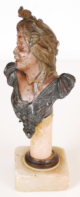 Festett spiáter szecessziós hölgy szobor alabástrom talpazaton, m: 15 cm