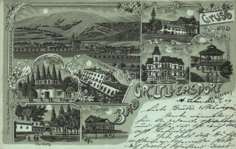 Velké Losiny, Gross Ullersdorf; Schloss, Villa Franziska, Villa Marie, karlsquelle, Fürstenhaus, Elisabethquelle, Kurplatz / castle, villa, fountain, spa floral Art Nouveau litho (wet damage)