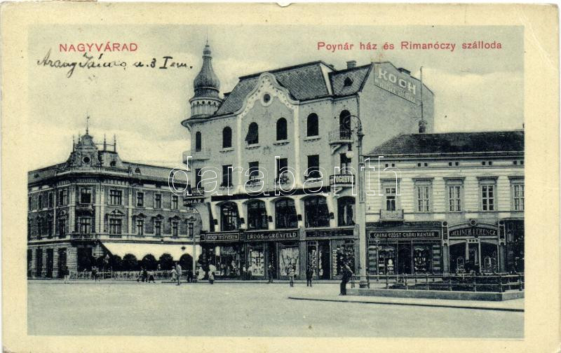 Nagyvárad, Poynár ház, Rimanóczy szálloda, Fogorvos, Koch ruhaáruház, China ezüstgyári raktár, Jelinek Ferencz, Erdős és Grünfeld és Dénes Béla üzlete / house, hotel, shops, dentistry (EK)
