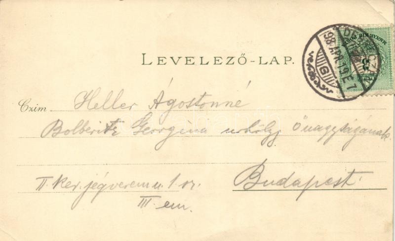 1898 Debrecen, Piac utca, Iparbank palota, színház, Evangélikus református kollégium, városháza, kiadja Pongrácz Géza, floral Art Nouveau litho (EK)