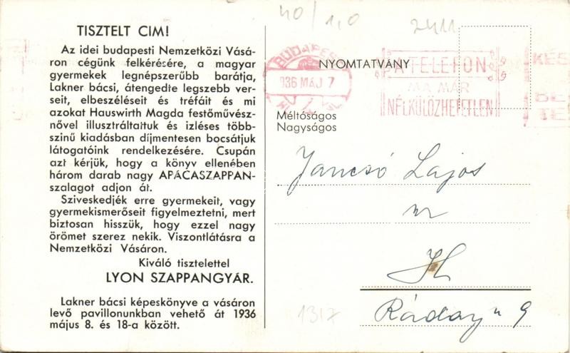 https://www.darabanth.com/en/22-Major-auction/22.1/Hungarian-postcards/Hungary~8694/1936-Budapest-Nemzetkozi-Vasar-Lyoni-szappangyar-nyeremenyjateka-the-Lyon-soap-factorys-a~II1118969