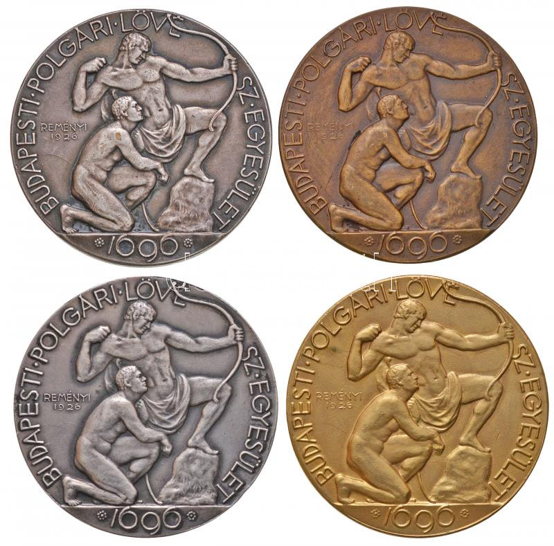 Reményi József (1887-1977) 1926. "Budapesti Polgári Lövész Egyesület 1696 / 'Hazádat és királyodat védeni tanuld itt'" jelzetlen Ag, ezüstözött Br, aranyozott Br és Br emlékérem és díjérem, egy kivétellel "BERÁN N. BPEST" gyártói jelzéssel (45mm) T:2