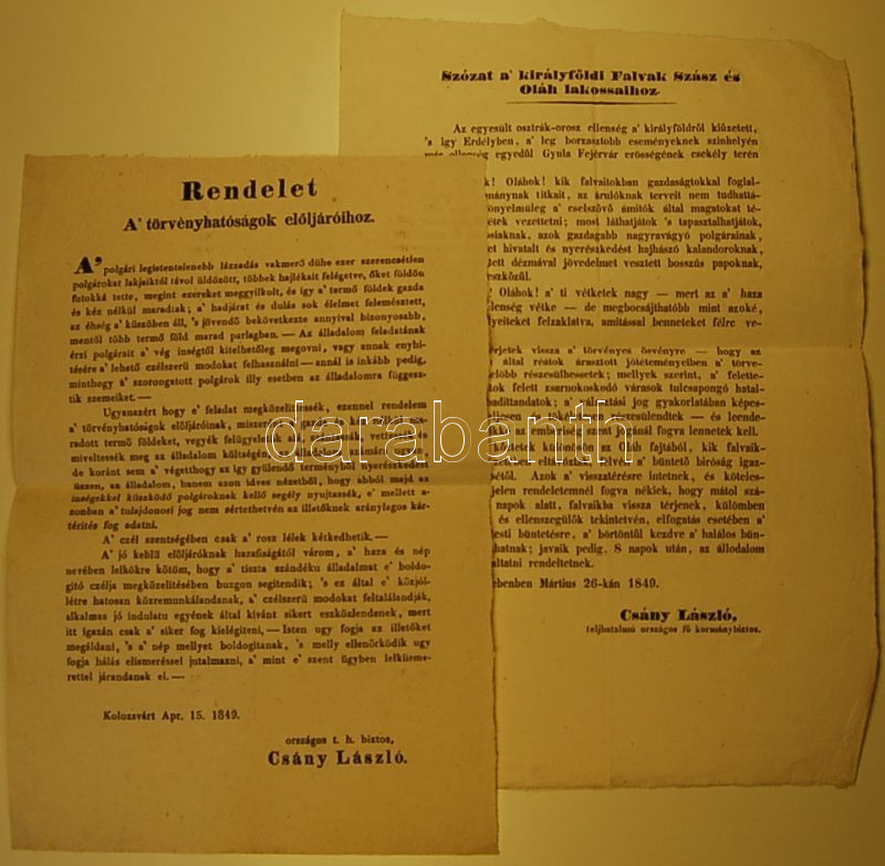 https://www.darabanth.com/en/22-Online-auction/22.0/Other-collectibles/~177/Csanyi-Laszlo-erd-kormanybiztos-2-kialtvanya-a-szaszokhoz-es-olahokhoz-1849-marc-apr~II42690