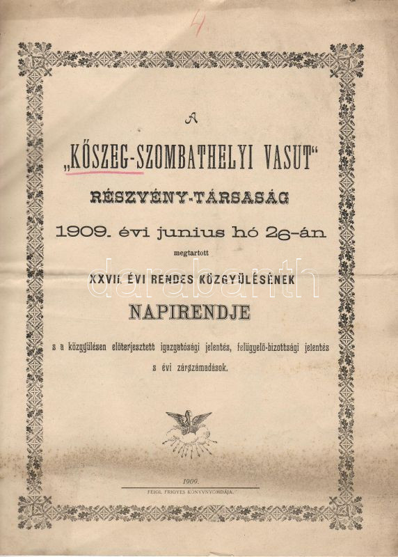 https://www.darabanth.com/en/22-Online-auction/22.0/Other-collectibles/~183/1909-A-Koszeg-Szombathelyi-vasut-Rt-kozgyulesenek-napirendje-Feigl-Frigyes-konyvnyomdaja~II43146