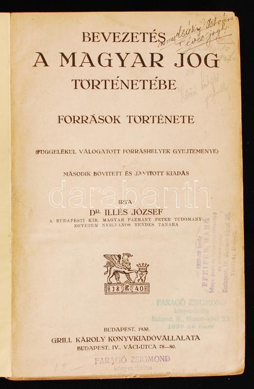Description: 2 db jogi témájú könyv: Illés József: Bevezetés a magyar jog történetébe. Források története. Bp., 1930, Grill Károly Könyvkiadóvállalata. Félvászon kötésben, az elülső borító, az első néhány lap és a gerinc elválik.; Angyal Pál: A magyar bűnvádi perrendtartás hatályos jogszabályai. Bp., 1942, Grill Károly Könyvkiadóvállalata. Kopott vászonkötésben, egyébként jó állapotban.