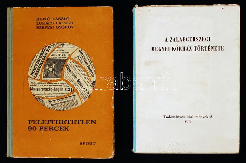 Description: 2 db könyv-Rejtő László-Lukács László-Szepesi György: Felejthetetlen 90 percek. A magyar labdarúgó-válogatott 400 mérkőzése. Bp., 1964, Sport. Kiadói félvászon kötés, fotókkal illusztrált, kopottas állapotban; Dr. Szilvás Ruolf(szerk.): A Zalaegerszegi Megyei Kórház Története. Tudományos közlemények 3. 1973. Kiadói papírkötés, kopottas állapotban.