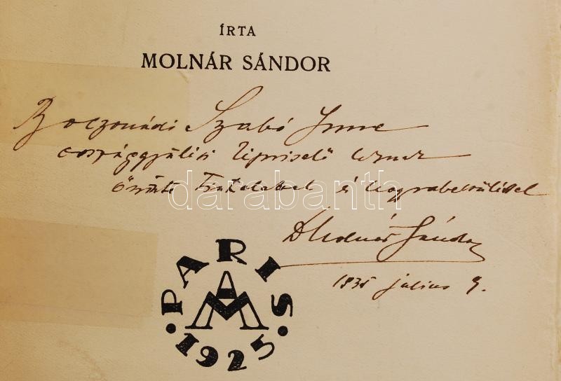 Description: Molnár Sándor: Magyar sors francia földön. Párizs, 1925, Párizsi Magyar Akadémia. A szerző által 1935-ben Boczonádi Szabó Imre Zoltán (1882-1969) méhész, újságíró, országgyűlési képviselőnek dedikálva. Megviselt, utólag ragasztott papírkötésben.