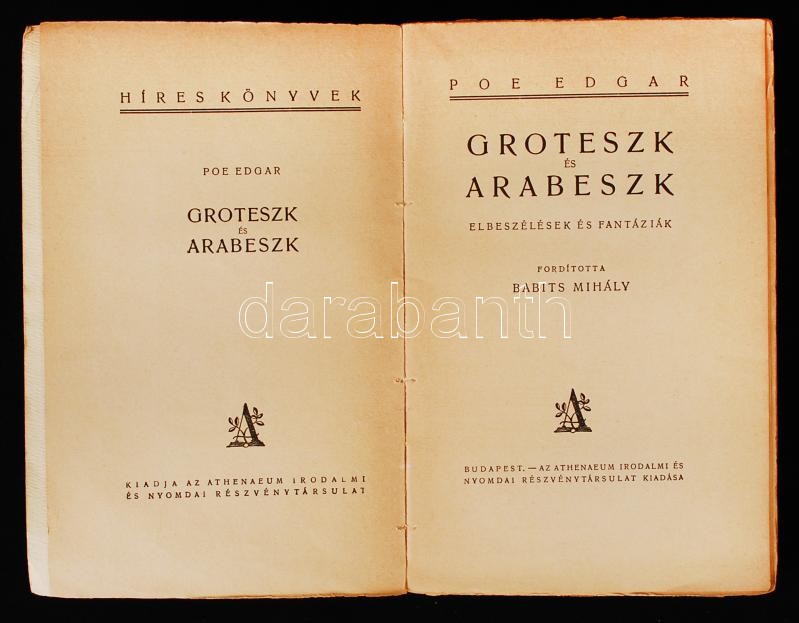 Poe, Edgar [Allan]: Groteszk és arabeszk. Elbeszélések és fantáziák. F... https://www.darabanth.com/en/220-Online-auction/220.0/Other-collectibles/Books-Other-rarities~10027/Poe-Edgar-Allan-Groteszk-es-arabeszk-Elbeszelesek-es-fantaziak-Ford-Babits-Mihaly-Bp~II944106