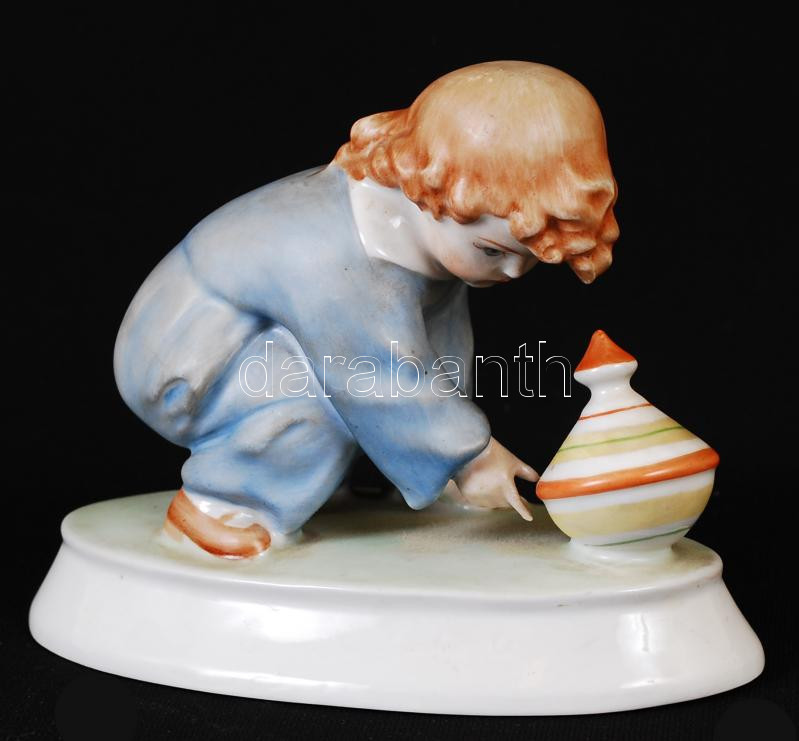 Zsolnay búgócsigával játszó gyerek, kézzel festett, jelzett (Sinkó), hibátlan, 13×15 cm / Handpainted Zsolnay chinaware figure in flawless condition