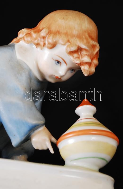 Zsolnay búgócsigával játszó gyerek, kézzel festett, jelzett (Sinkó), h...