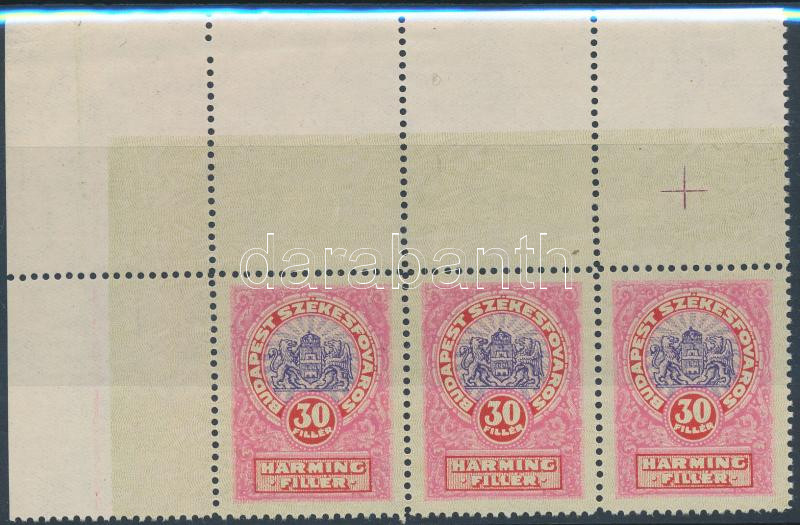 1931 Budapest Székesfőváros városi illetékbélyeg 30f ívsarki hármascsíkban