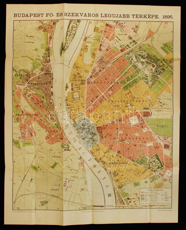 Description: 1983 Budapest térképe házszámok megjelölésével és az utcák és terek betűrendes jegyzékével. Készítette: Homolka József. Plan von Budapest mit Angabe der Hausnummern und Alphabetischem Strassenverzeichniss. Eredetileg megjelent: Bp., Eggenberger Könyvkereskedés, 1896. Reprint: Kartográfiai Vállalat, 1983, a "Budapesti Üdvözlet" c. könyv mellékleteként, 67×57 cm